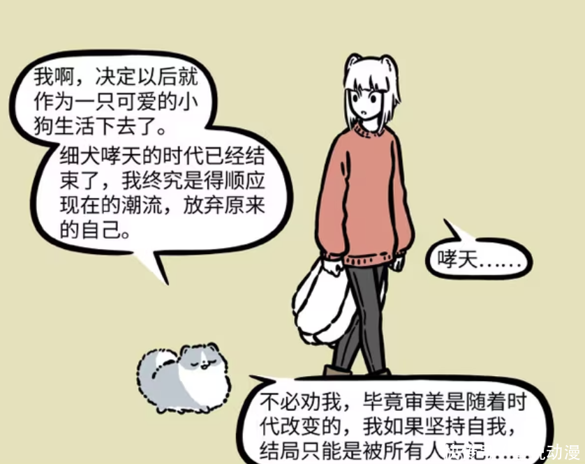 《非东说念主哉》漫画版中,哮天为了更受宽待,找地藏菩萨造成可人的神志。不外九月并不可爱可人版哮天,因为东说念主格式看不到那一张帅气的脸。哮天蓝本就念念这样生存,不外小玉出现后就不同样。唯有小玉能叫醒他的本能,最终让地藏菩萨将他变且归。
