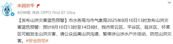 新京报讯 据水润京华微博讯息,北京市水务局与市昂扬局2025年8月10日13时发布山洪灾害蓝色预警:展望8月10日13时至14日8时,北京市密云区、平谷区、延庆区、怀柔区可能发生山洪灾害,请公众辩认山洪沟谈,暂停涉山涉水户外举止,防患山洪灾害。