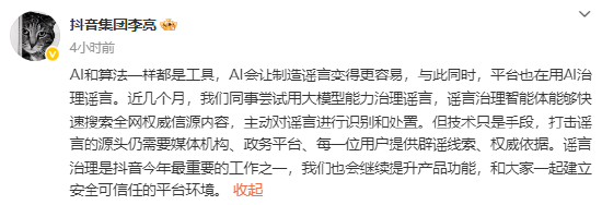 他指出,时刻仅仅技能,打击坏话的起源仍需要媒体机构、政务平台、每一位用户提供辟谣踪迹、巨擘依据。坏话管制是抖音本年最进攻的职责之一,抖音也会链接普及家具功能,和大家通盘拓荒安全的确任的平台环境。