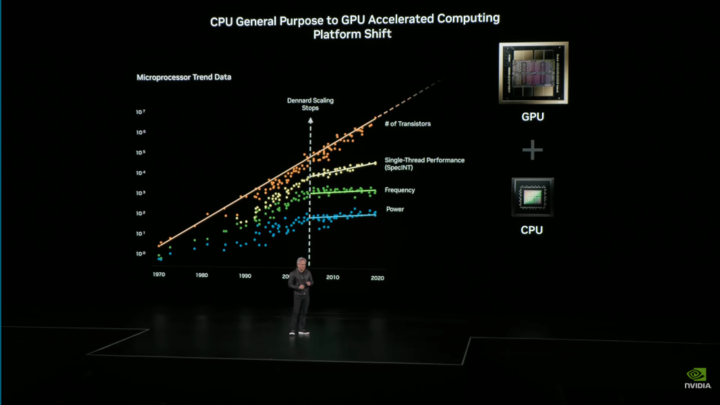 这个不雅点不崭新了,然而黄仁勋又强调了一遍。他指出,刻下期间的变革始于一个错误不雅察:Dennard 缩放定律(Dennard scaling)已住手近十年,晶体管的性能和功耗增益受到物理定律的甘休,传统摩尔定律的红利正在消退。