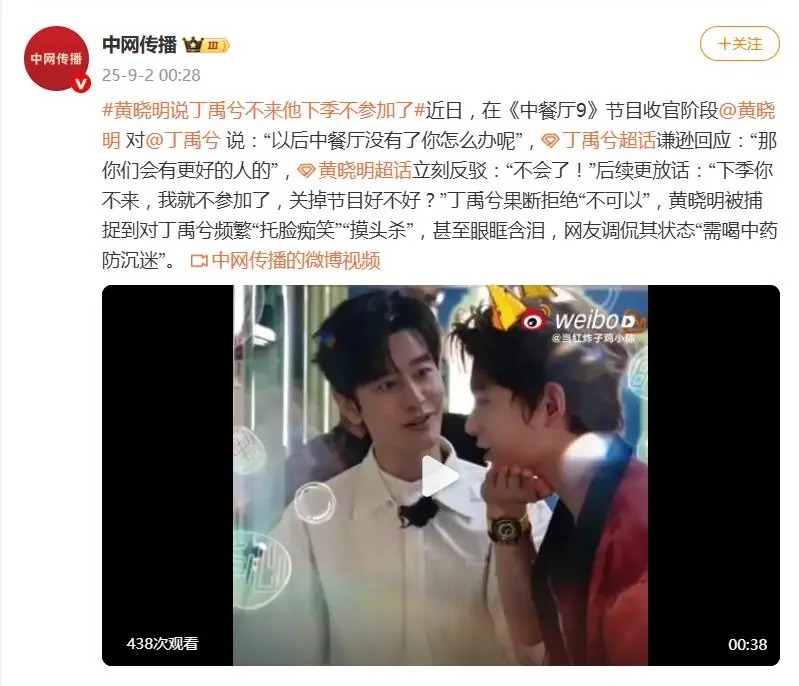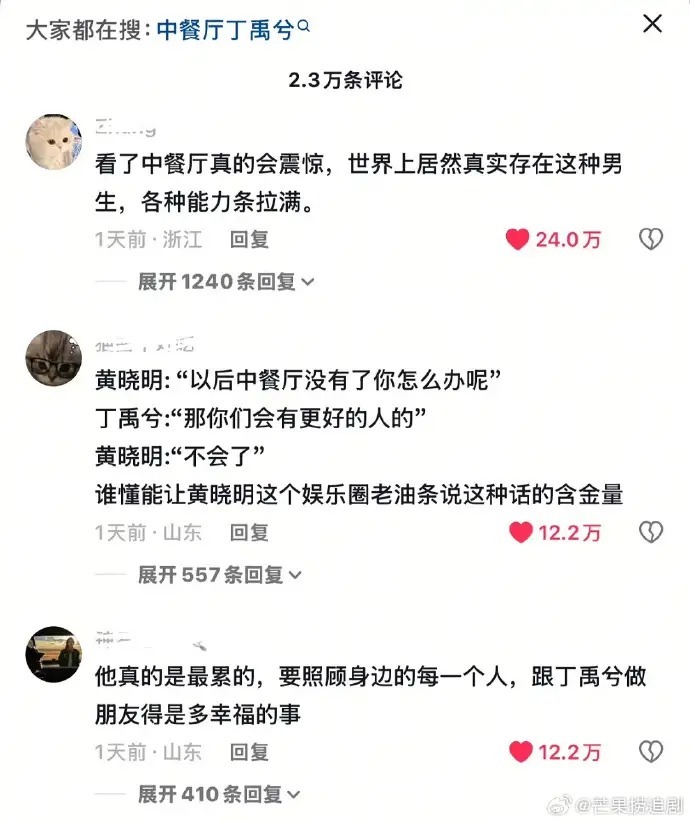 这场激励全网围不雅的“依赖宣言”发生在节目尾声。黄晓明对着丁禹兮感叹:“以后中餐厅莫得了你怎样办呢?”,丁禹兮柔顺复兴“那你们会有更好的东谈主的”,却坐窝被黄晓明打断:“不会了!”紧接着,他便抛出“你不来我不录”的终极表态,眼眶含泪、口吻刚烈,被不雅众笑称“堪比偶像剧台词”。
