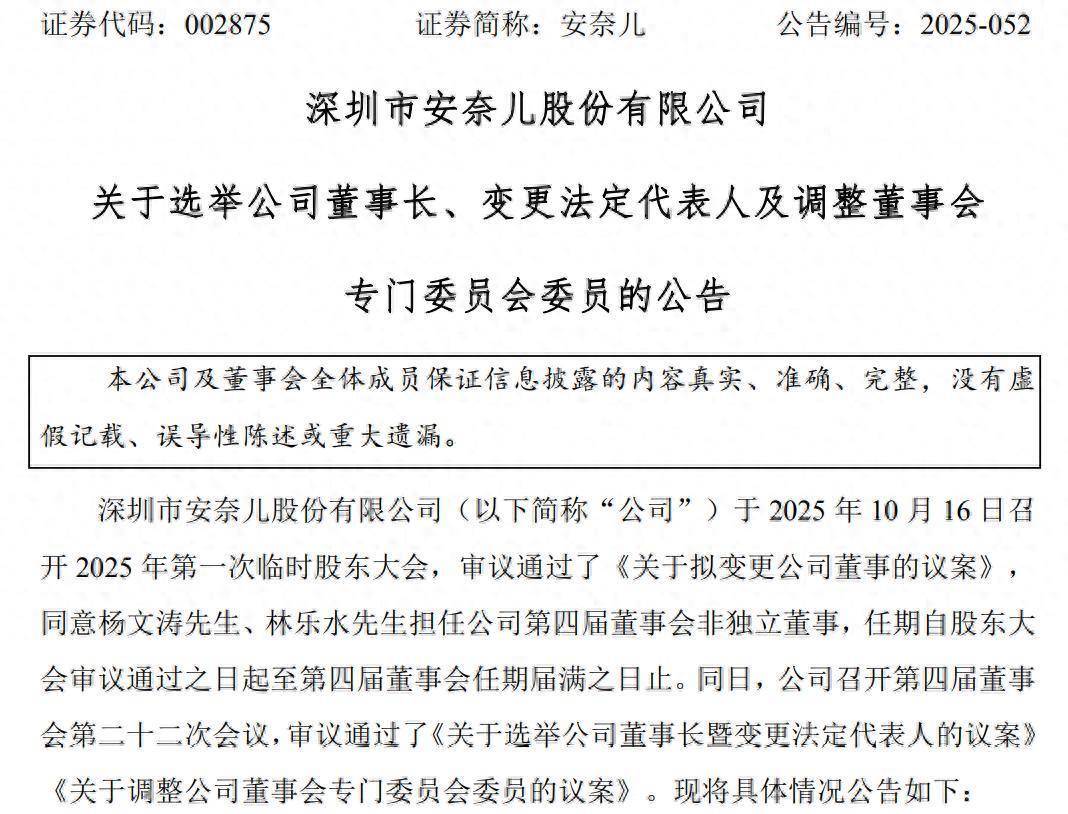 此前,9月29日晚间,安奈儿公告公司部分董事及高档责罚东说念主员发生变更。